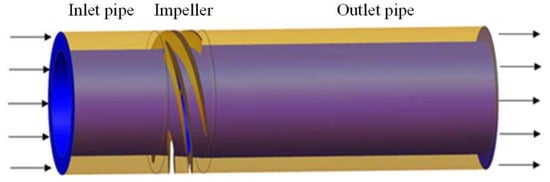 An impeller was selected to investigate the cavitation characteristics of a multiphase pump in this paper, and the computational domain was composed of inlet pipe, impeller pipe, and outlet pipe. To achieve full flow at the impeller inlet and outlet, the inlet and outlet were respectively extended to 2 and 6 times the axial length of the impeller, as shown in Figure 1. The design parameters of the pump are as follows: design flow rate Q = 100 m3·h−1, speed n = 3000 rpm, impeller blade number Z = 4, impeller blade wrap angle 179.6°, impeller inlet hub ratio 0.79, impeller outlet hub ratio 0.74, and impeller diameter 230.5 mm.