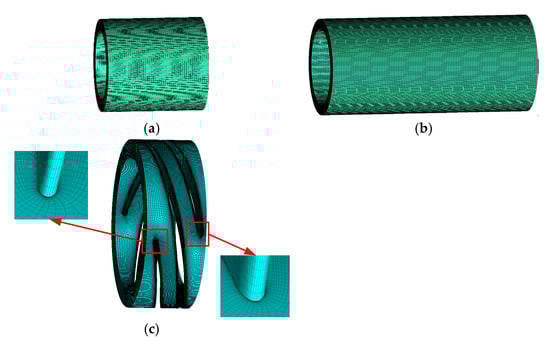 Computational mesh (a) inlet pipe; (b) outlet pipe; and (c) impeller.
