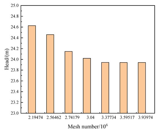 To improve the accuracy and efficiency of the numerical simulation, the mesh independence was verified. A total of 7 sets of meshes on the multiphase pump were performed and simulated at water case and design flow rate. The appropriate mesh number was selected for the final numerical simulation. The mesh independent verification is shown in Figure 3.