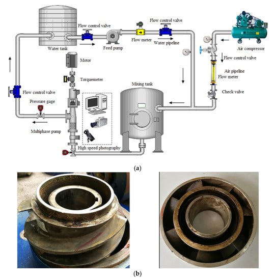 Experimental rig of the multiphase pump. (a) Schematic diagram. (b) Impeller and diffuser.