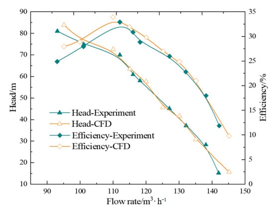 Figure 5 shows the comparison between the CFD and the experiment, and the head and efficiency in the CFD agreed well with the experimental one. Meanwhile, the relative errors of the head and efficiency at the optimal point were 4.1% and 4.1%, respectively. The maximum relative errors of the head and the efficiency were both no more than 5%, and this shows that the simulation is reliable.