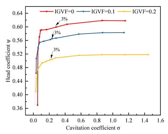 Figure 6 shows that the head coefficient ψ of the multiphase pump varies with the cavitation coefficient σ. For Figure 6, under IGVF = 0, 0.1 and 0.2, with the decrease of the cavitation coefficient σ, the head coefficient ψ remains unchanged at first, then steadily decreases, and finally decreases sharply.
