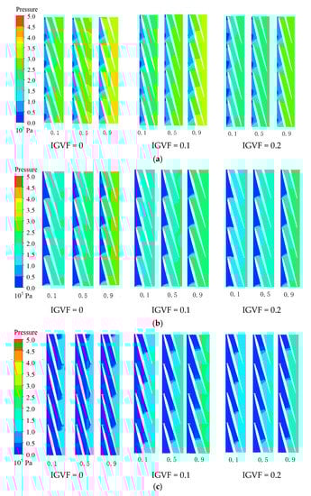 Pressure on 0.5 blade span at IGVF = 0, 0.1, 0.2. (a) IGVF = 0; (b) IGVF = 0.1; (c) IGVF = 0.2.