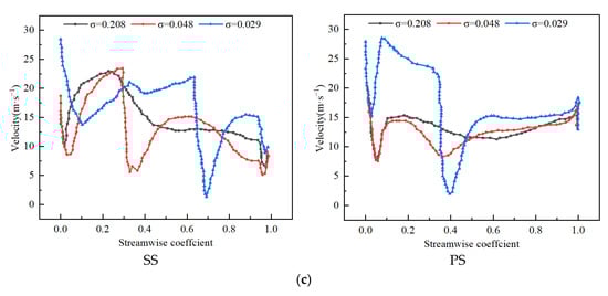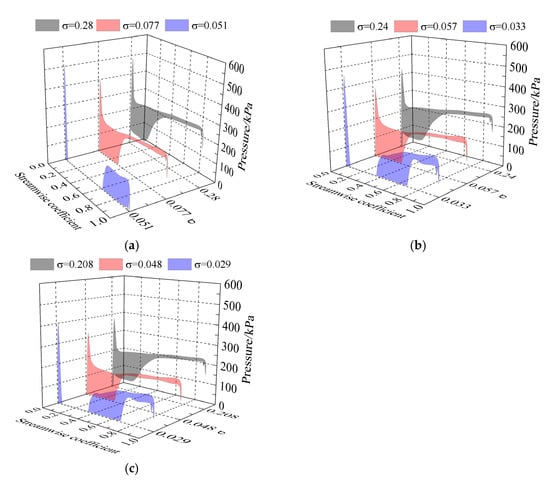 In Figure 8a, when the cavitation is weak, the pressure on the PS increases steadily from the inlet to the outlet along the streamwise. However, the pressure on the SS first maintains 80 kPa in the streamwise of 0~0.3, then increases, and finally remains at a steady increasing trend. When the cavitation coefficient is reduced to 0.077, the pressure on the blade SS is basically unchanged from the critical cavitation. Meanwhile, the pressure on the blade SS in the streamwise of 0~0.32 is about 3170 Pa. When the cavitation coefficient σ is reduced to 0.051, the cavitation on the blade PS extends to the streamwise of 0.05~0.62, and the SS is completely occupied by cavitation. Then, the blade load in the streamwise of 0.05~0.62 becomes 0, and the blade load from the streamwise of 0.62 to the blade outlet becomes larger.