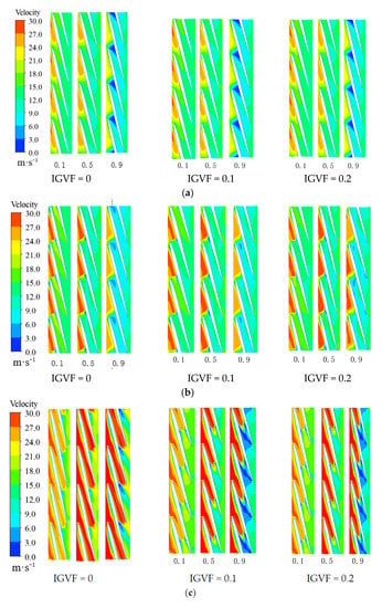 Velocity distribution at 0.5 span under IGVF = 0, 0.1, 0.2. (a) IGVF = 0; (b) IGVF = 0.1; (c) IGVF = 0.2.
