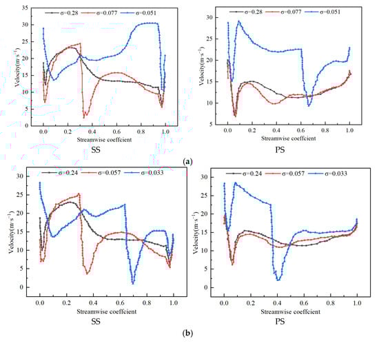 To quantitatively analyze the effect of the development of cavitation on the velocity distribution under the different IGVFs, the velocity distribution at 0.5 span along the streamline direction is analyzed below. Figure 10 shows the velocity distribution at 0.5 span along the streamwise with IGVF of 0, 0.1 and 0.2 under different cavitation stages.