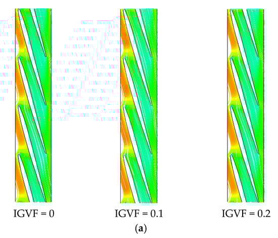 From Figure 11, in the critical cavitation, the velocity streamlines in the flow passage are relatively smooth at different IGVFs. When the cavitation develops to the second stage, due to the large pressure gradient at the end of the bubbles, a backflow vortex appears at the end of the bubbles on the blade SS. When the cavitation develops to the third stage, at IGVF = 0 the backflow vortex appears at the end of the bubbles on the blade PS due to the large reverse pressure gradient. However, a backflow vortex appears at the end of the bubbles on the PS and SS with IGVF = 0.1 and 0.2.