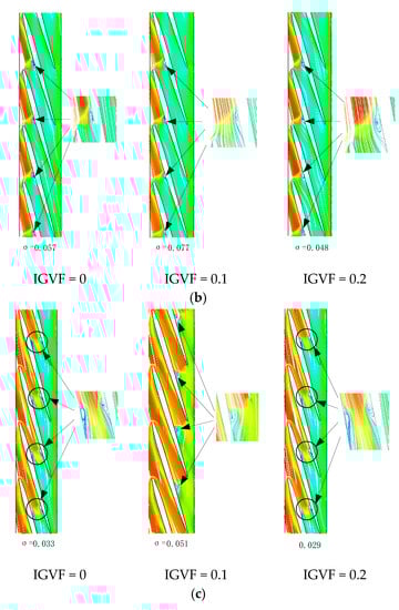 Velocity streamlines at 0.5 span under IGVF = 0, 0.1 and 0.2. (a) Critical cavitation; (b) severe cavitation; and (c) fracture cavitation.