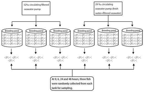 The juvenile yellowfin tuna were provided by Lingshui Research Station of Tropical Fisheries Research and Development Center, South China Sea Fisheries Research Institute, Chinese Academy of Fishery Sciences. The length and weight of the experimental fish were 28.97 ± 2.17 cm and 646.52 ± 66.32 g, respectively. A total of 72 fish were randomly distributed into six 5000 L fiberglass tanks with recirculating seawater systems for a 7-day acclimation. The fish were fed daily from 08:30 to 09:00. Fresh miscellaneous fish (4 cm × 2 cm pieces) were fed with 5–8% body weight daily by satiety. No feeding was conducted on the day before and during the experiment. During the experiment, all of the tanks were supplied with filtered seawater with a water exchange rate of 300% tank volume per day. The ambient salinity of 32‰ was used as the control with three replicates, and 29‰ was used as the stress group with three replicates (Figure 1). The salinity of the stress group was gradually adjusted by adding tap water with 24 h aeration to the natural filtered seawater at 1‰ per 1 h. When the salinity of the stress group reached 29‰, the experiment began. The experiment lasted 48 h. The photoperiod was maintained at 14:10 h (light:dark). The salinity, water temperature, DO, and pH were monitored using an HQ40d portable multi-parameter (HQ40d18, Hach, Loveland, CO, USA), and the nitrite nitrogen and ammonia nitrogen were measured by a nitrite nitrogen testing kit (Zhecheng Biotechnology, Beijing, China). During the experimental period, the water temperature was maintained at 29.5 ± 0.5 °C, DO was >7.50 mg·L−1, pH was 7.93 ± 0.12, ammonia nitrogen was <0.1 mg·L−1, and nitrite nitrogen <0.05 mg·L−1.