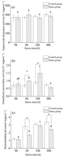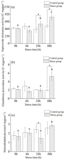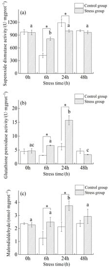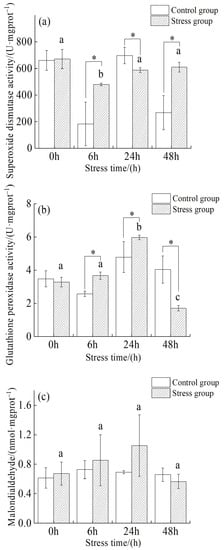 The SOD activity in the fish gills in the stress group increased with time from 0 to 48 h and reached the maximum value at 48 h (830.86 ± 80.66 U·mgprot−1, Figure 2a). The SOD activity in the fish gills of the stress group was significantly higher than those in the control group at 24 h and 48 h (p < 0.05, Figure 2a). The GSH-Px activity in the stress group was not significantly different from 0 h to 24 h (p > 0.05), and reached the maximum value of 5.25 ± 1.01 U·mgprot−1 at 48 h (p < 0.05, Figure 2b). In the stress group, the MDA content in the gills of the juvenile yellowfin tuna was not significantly different from 0 h to 24 h (p > 0.05), and the highest value (2.87 ± 0.12 nmol · mgprot−1) was observed at 48 h (Figure 2c).