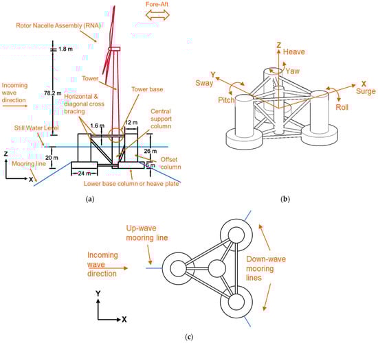 OC5 project FOWT model details: (a) FOWT full-scale model side view; (b) semi-submersible foundation degrees of freedom; (c) semisubmersible foundation top view showing the mooring line setup.