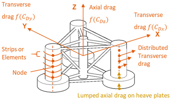 The dimensionless drag coefficients were applied in the transverse (x,y) directions along each strip of a member. The mathematical formulation for the application of Morison drag term along the transverse directions (x,y) in the HydroDyn module of OpenFAST is given by Equation (6). Note that HydroDyn does not distinguish the drag between the transverse directions (x,y).