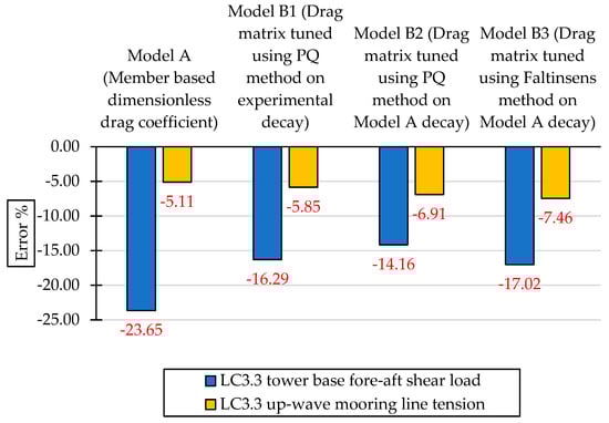 The Model B variants, namely B1, B2, and B3, differ in the source and method of tuning the drag matrix as shown in Table 4. Model B1 represents more a conventional tuning of the drag matrix based on the experimental OC5 data using the PQ method. Models B2 and B3 implement a novel tuning of the drag matrix based on the Model A decay results using the PQ and Faltinsen’s methods, respectively.