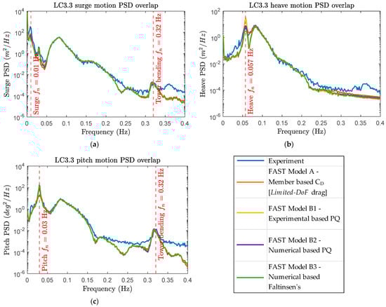 The use of a tuned linear and quadratic drag matrix, along with potential flow theory, has shown improved estimates against experimental data, particularly for low-frequency pitch motion and response in past investigations [14,20]. The tuning is performed using the system free decay tests in the desired degree of freedom (surge, heave or pitch). However, a tuned linear (P) and quadratic (Q) drag matrix, or the so-called PQ approach, was not studied in the previous OC5 validation campaign [14]. It is hypothesized that underestimates of the global hydrodynamic loads, particularly the tower base fore-aft shear, is due to mischaracterization of the rotational degree of freedom (DoF) hydrodynamic quadratic drag, because tower base moment-induced shear on a FOWT is strongly influenced by the rotational DoF pitch caused by the wave excitation [13], refer to Figure 1a,b. Similarly, up-wave mooring line tension is strongly influenced by the translational DoF surge, refer to Figure 1b,c. Both platform pitch and surge are excited by differences in hydrodynamic pressure along the wave, which were strong for this FOWT platform [25].