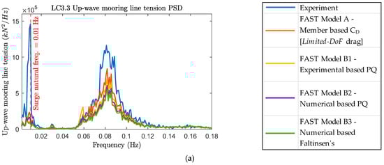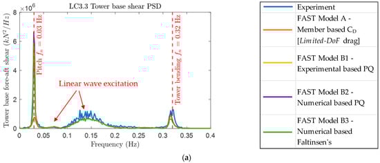 The results from the OpenFAST numerical simulations using the four different hydrodynamic quadratic drag models (Models A, B1-B3) are presented below for the OC5 FOWT; subjected to the LC3.3 irregular wave-only loading (refer to Table 2) defined using the JONSWAP spectrum parameters: significant wave height ( = 7.1 m), peak period ( = 12.1 s), and peak enhancement factor ( = 3.0). Results were analyzed in both the time and frequency domains and compared in terms of global tower base fore-aft shear and up-wave mooring line tension. The time domain history plots for tower base fore-aft shear and up-wave mooring line tension are shown in Appendix B.