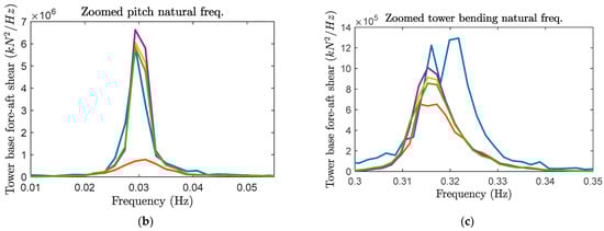 In the case of tower base fore-aft shear, the mean loads for the numerical models were relatively different from the experiment, regardless of the type of damping model. The difference in mean loads between the numerical models and the experiment may be attributed to the experimental setup and its uncertainties as described before in Section 2 (Numerical-Experimental Campaign). The absolute value of the mean is considered in the calculation of the tower base fore-aft shear CoV.