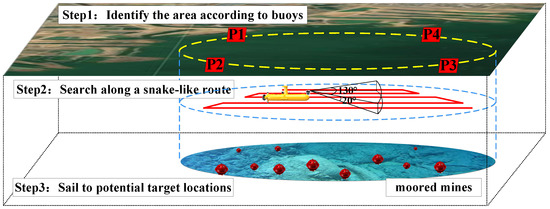 Due to an increasing number of maritime accidents, underwater object detection applications such as search [1,2,3], rescue and track [4,5,6] missions have received extensive attention in both the civil and military fields. How to use existing equipment to quickly and accurately detect and identify high-value targets in underwater environments has become an urgent problem. Nowadays, intelligent equipment is widely researched [7,8]. AUVs are recognized as appropriate platforms to complete wide-area search missions [9,10]. When operating underwater, the AUV uses a forward-looking sonar mounted on the bow to detect targets of concern along a snake-like route that covers a designated area. If a series of suspected targets are detected, then the AUV will sail to each possible target location and conduct another close inspection, see Figure 1 for illustration. In this process, the autonomous task allocation capability of an AUV is particularly significant because it is necessary to determine the best order of approaching all targets, which can be described as a TSP [11].