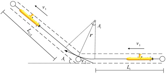 where ; n is the number of suspicious targets; and and are linear speeds (measured in knots) at straight segments and curves, respectively. As shown in Figure 2, r is the turning radius and and are the length and angle of rotation (measured in degrees) of the i-th path segment, respectively. T is the total operation time.
