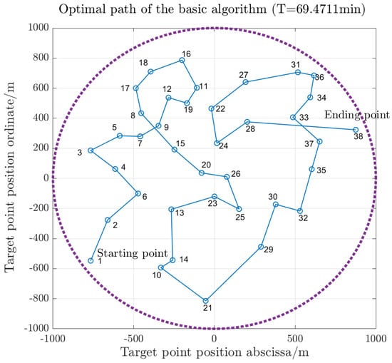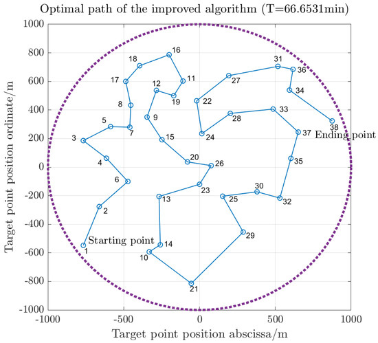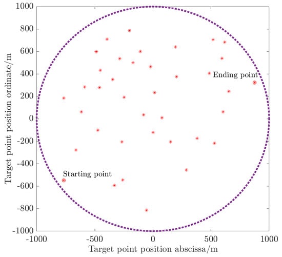 In this section, an example is provided to validate the feasibility and effectiveness of the improved ACO algorithm. The effect of the improved algorithm is compared with that of the original ant colony algorithm and the IACO algorithm in [39]. In a scenario where an AUV and an unmanned surface vehicle (USV) cooperate to detect underwater high-risk targets, it is assumed that the USV has found 36 suspected targets in a circular area with a radius of 1000 m, as shown in Figure 4. The AUV is arranged to sail closer to each target for fine-grained recognition and verification. The cruise speed of the AUV is 4 kn, and the turning speed is 3 kn.