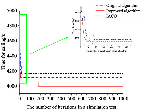 Figure 9 describes the corresponding relationship between the number of iterations and operation time T in a simulation test, reflecting the convergence property of the algorithm. It is easy to see that the improved algorithm converges much more quickly than the original algorithm and the IACO algorithm at earlier stages in the iteration. As the iteration process progresses, the search for a solution with the lowest path cost among all feasible solutions is continuing, and the problem of the optimization process becoming trapped at a local optimum is avoided. Obtaining such satisfactory results is entirely due to the development of a pheromone update rule. In early iterations of the algorithm, the modified update rule enables a rapid accumulation of pheromones on the preferred path, which strengthens search orientation and encourages subsequent ants to assemble towards the preferred path. In later phases of iterations, the modified update rule weakens the positive guiding effects in the search direction in order to increase the global search ability of the algorithm.
