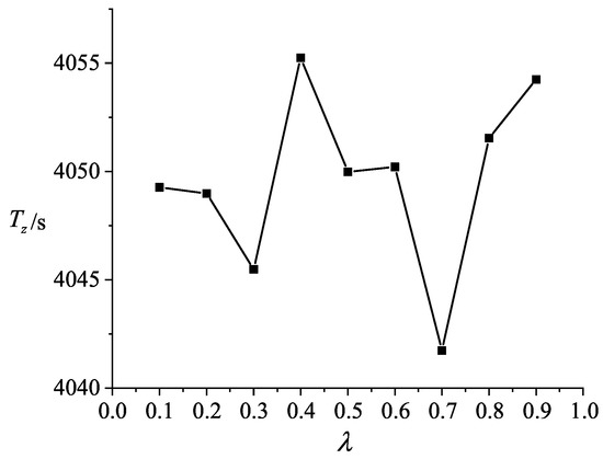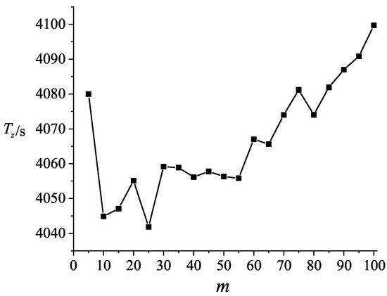 In the following content, we will analyze and discuss the issue of parameter settings in our proposed algorithm. Except for parameters to be analyzed, the settings of other parameters are consistent with those in Table 3. A total of 20 simulations are conducted, and the average of the simulation results is regarded as the final result. Define total time as , where is the running time of the algorithm. The curve in Figure 10 depicts the relationship between total time and ant population m. The number of ants corresponding to the lowest total time is 25. We can also see from Figure 10 that the increase in the number of ants provides a boost in the global search capacity of the algorithm. However, an excessive increase does not provide much assistance in the improvement of the optimization ability of the algorithm; instead, it makes the computational resource consumption higher and the total time longer.