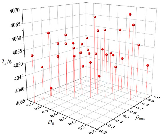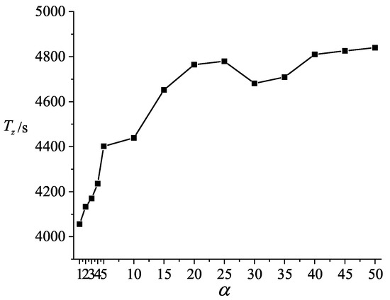 A variation curve of total time with respect to pheromone weight is given in Figure 12. It can be seen that with the increase in , the presents an upward trend. The reason is that the larger is, the greater the probability that the ant will choose the path it traveled before, which makes the search less random. Taking the data in Figure 12 as a reference, it is more appropriate to set to 1.