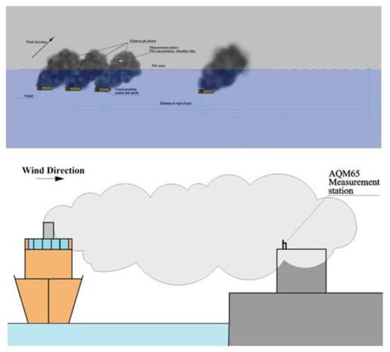 Research is based on using ship AIS positions and exhaust gas plume analysis. Due to the geographical positioning of the port of Klaipeda, ships move along a narrow channel in the Curonian lagoon, along Klaipeda city. During the western winds, the exhaust gas plume is blown to the port and the city and can be registered by the air pollution analysis equipment positioned in the port. During the movement of the ship, the exhaust gas plume moves in parallel to the ship; when the plume moves through the measurement station, the data on the concentrations of the horizontal slice of the plume is registered (Figure 1).