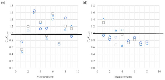 Comparison of measured and calculated concentrations: (a) bulk cargo ship, (b) chemical tanker, (c) trawler, (d) refrigerated cargo ship.