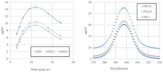 The deployment of the model allows for the evaluation of different conditions and impacts of ship exhaust gas plume. Model deployment was performed by supplying the ANN with data from an average tugboat with an engine power of 2500 kW and at a distance of 135 m, moving at speeds of 10.7 knots (20 km/h). Different wind speed was modeled for the same location. It was determined that the biggest concentration reaches the shore when wind speed is in the range of 9–12 m/s for all particulate matter sizes. At wind speeds of 3 m/s and less, the concentration becomes indistinguishable from the background. The structure of the plume was presented in Figure 5. The full exhaust gas plume concentration range was obtained by changing the wind direction from a single vessel source at the same distance during a wind speed of 9 m/s. The peak concentration reaches 27 µg/m3 for PM10, 21.6 µg/m3 for PM2.5, and 20 for PM1.