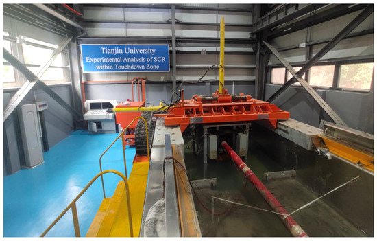Some theoretical and numerical analyses of SCR adopt rigid or elastic seabed models, which produce unrealistic results of the fatigue performance of SCR [3,4]. Based on the pipe–soil interaction model tests, several advanced vertical riser–seabed interaction models have been proposed and integrated into the finite element models [5,6,7,8]. The degradation of soil caused by the disturbance of the riser segment can be recorded, and the suction force can be simulated. Based on the nonlinear riser–seabed interaction model proposed by Randolph and Quiggin [6], the effects of different seabed stiffness, suction ratio, and loading period on the fatigue damage of SCR were analyzed [9]. A seabed trench was developed under the oscillation of the SCR within several months [10], which also affected the mechanical behavior of the riser. The trench could be artificially inserted into the numerical model using a mathematical formulation [11], and the fatigue damage of the SCR was reduced. Using the R-Q soil model, Shiri [12] proposed a method to develop the seabed trench automatically to ensure consistency between the trench and SCR. Simulation results proved that the developed trenches have detrimental effects on the fatigue behavior of the SCR. The trenches developed using an artificial formulation, step method, and automatic method were compared and inserted into the SCR model by Randolph et al. [13], and the dynamic simulations showed that the fatigue damage of the SCR was significantly affected by the trench shape. Since the static offsets and low-frequency motions of the floating platform also contribute to the trench formation, Yu et al. [14] compared the trench shapes developed under different vessel motions and studied the trench effects on the fatigue life of the SCR using the inserting method. Shoghi and Shiri [15] and Shoghi et al. [16] simplified the trench using sloped lines and figured out how the seabed trenches influenced the fatigue damage of the SCR. These nonlinear riser–soil interaction models and seabed trenches mainly focused on determining the vertical seabed resistances; however, sophisticated lateral soil models have not been proposed and applied. Therefore, experiments should be carried out to determine the effect of horizontal riser–soil interaction on the behavior of SCR. Furthermore, the reliability of the nonlinear vertical soil models in a global SCR model still needs to be verified through experimental analysis.
