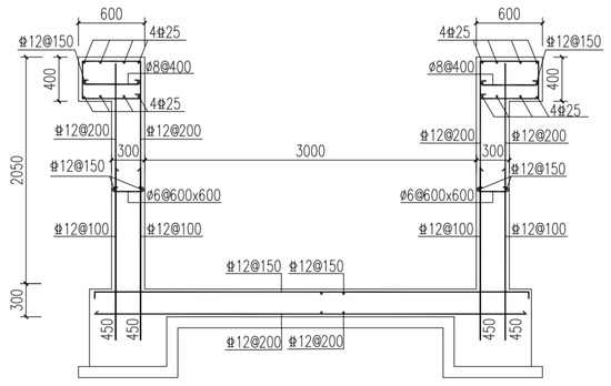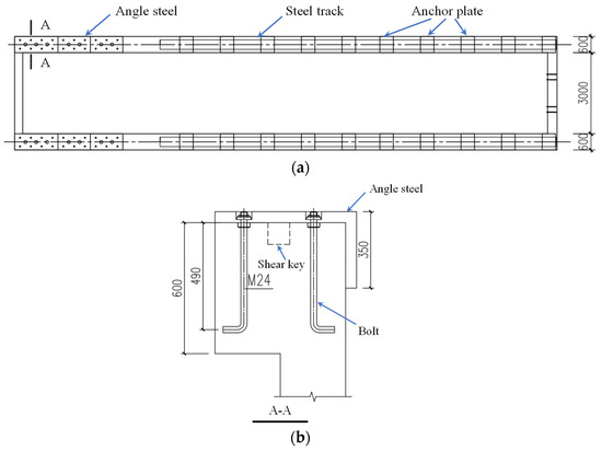 The length, width, and depth of the reinforced concrete soil tank were 20.05 m, 3.6 m, and 2.05 m, respectively. Under the soil tank, 6 bored cast-in-place piles were constructed and connected using the foundation beams to improve their rigidity and prevent the decline or settlement of the tank. The side wall thickness of the soil tank was 300 mm to sustain the pressure of clay. The cross section of the tank and the arrangement of reinforcements are shown in Figure 2. The plan view of the soil tank is shown in Figure 3a. Within the moving range of the loading device, the angle steel with 50 mm thickness was fixed to the surface of each side wall using bolts and shear keys, as shown in Figure 3b. For the other part of the tank, the track of the stirring system was arranged along the top of each side wall using the anchor plates. After construction, stainless-steel plates were installed on each surface of the tank for protection.