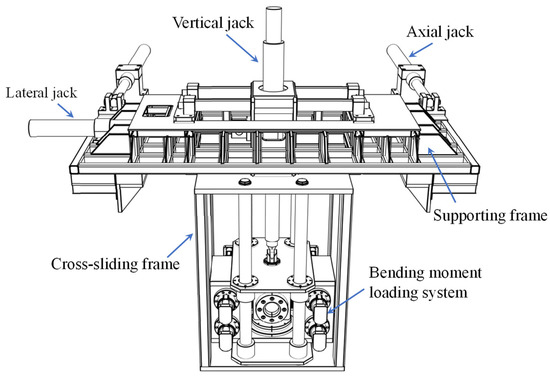 Assembly of the supporting frame, cross-sliding frame, and displacement and bending moment loading systems.