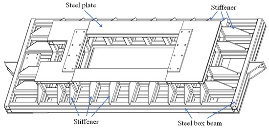 The supporting frame was constructed by welding the steel plates and steel box beams together. The three-dimensional illustration of the frame is shown in Figure 5. The purpose of this frame is to sustain the weight of the whole loading facility and the reaction force during the test. Instead of using thick steel plates, the adoption of steel box beams could reduce the self-weight and increase the flexural rigidity. Stiffeners were arranged around each side of the frame to further increase the rigidity. Since the frame should avoid any movement during the test, the electromagnets were activated to link the supporting frame and the angle steel on the soil tank.