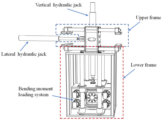 The cross-sliding frame can accommodate the in-plane movement of the loading end of SCR. Its structure can be decomposed into the upper frame and the lower frame, as shown in Figure 6. In the upper frame, four steel rods were fastened to the supporting frame, and a sliding block was driven to slide along the rods through the lateral hydraulic jack. The vertical hydraulic jack was fixed to this sliding block. The steel plate at the top of the lower frame was also welded to the bottom of the box-shaped sliding block, and therefore, the central line of the vertical hydraulic jack would always coincide with that of the lower frame. The lower frame constituted two steel plates and four steel box columns, exhibiting the advantages of lighter self-weight and higher bending rigidity. Four steel rods were arranged within the columns as the guide of the bending moment loading system. Meanwhile, the rods also contributed to increasing the flexural rigidity of the lower frame.