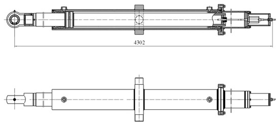 The displacement loading system is composed of axial, lateral, and vertical hydraulic jacks. The structure of the vertical loading jack is shown in Figure 7 as an example. Since the purpose of the axial jacks was to locate the supporting frame, only low-speed displacement was allowed, whereas the other jacks could realize high-speed cyclic loading. The strokes of the axial, lateral, and vertical jacks were 960 mm, 1010 mm, and 1200 mm, respectively. For the in situ deep-water SCR, the period of short-term heave motion and sway motion is concentrated within 5~12 s. If the lowest period is reached, the moving range of the truncated point of SCR is small. The highest loading frequency of the jacks was 0.5 Hz when the loading amplitude was 100 mm, and 0.17 Hz when the loading amplitude was 300 mm. Therefore, the loading capacity of the hydraulic jacks can fulfill the aim of reproducing the moving condition of an in situ SCR.