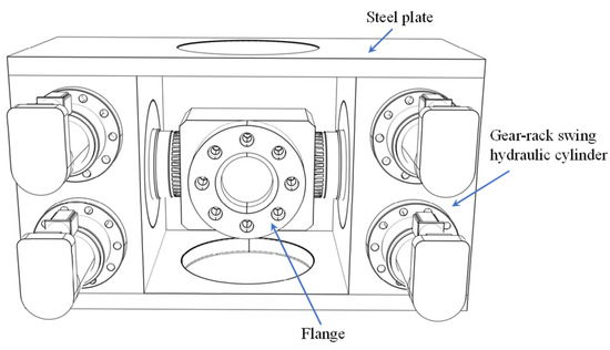 To provide the bending moment to the loading end of SCR, two gear-rack swing hydraulic cylinders were assembled to form the bending moment loading system, as shown in Figure 8. The top and bottom of the chambers were connected through steel plates, and both output axes of the cylinders were aligned to rotate the flange simultaneously. The three-dimensional view and profile of the hydraulic cylinder are shown in Figure 9. For each cylinder, the maximum rotating angle was ±15° and the rated operating pressure was 21 MPa. Under this pressure, the output torque was 22.3 kN·m. Therefore, the total bending moment that could be provided to the SCR was 44.6 kN·m during the configuration-building stage. During the cyclic loading stage, the bending moment should be calculated through the stress analysis of the SCR rather than the sensor, because the rotating angle is restricted.