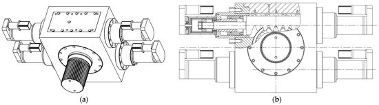 Structure of the gear-rack swing hydraulic cylinder: (a) three-dimensional view and (b) profile.