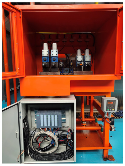 The hydraulic power units contain four electric motors with a rated power of 22 kW, one electric motor of 11 kW, four hydraulic pumps, an air-cooling system, a fuel tank, and auxiliary equipment including piezometers and valves. The assembly is shown in Figure 10. The operating pressure of this system is 20 MPa, and the rate of flow is 120 L/min. To control the loading system through the electrical signal, electrohydraulic servo valves were integrated into the system. A shelf was constructed to accommodate the proportional valves, accumulators, filters, and an electrical control cabinet, as shown in Figure 11.