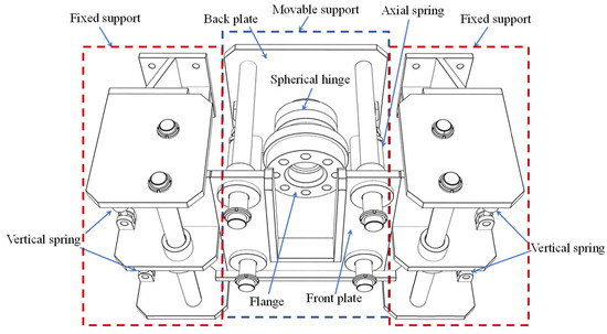 The elastic support is used to simulate the constraint effect of the flowline part of the riser to the model SCR. The structure can be decomposed into two fixed supports and one movable support, as shown in Figure 12. The fixed supports were anchored to the wall of the soil tank using high-strength bolts. For each fixed support, two steel rods were arranged as the guides of the movable support. A steel plate with circular openings could slide vertically along the rods, and its movement was restricted by the vertical springs. The front steel plate of moveable support was welded perpendicularly to the sliding steel plates and could only move vertically, whereas the back steel plate shared the same vertical position with the front one, and could move axially along four steel rods. The axial stiffness was provided by two axial springs, with one end fixed to the front plate and the other fixed to the back plate. All the springs in this elastic support are changeable, allowing the stiffness to be varied according to the requirement of the test. In this study, the vertical stiffness was set to a large value to avoid the maximum penetration of SCR concentrating within this area, whereas the axial stiffness was much lower, allowing the axial movement of SCR to avoid extremely large axial force during the cyclic displacement excitations. The flange was connected to the back plate of the movable support via a spherical hinge. Therefore, the SCR could rotate freely at this end, and the bending moment could be released.