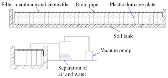 The properties of the test soil can significantly affect the mechanical behavior of the model SCR. Clayey soil with an undrained shear strength similar to that in deep water should be prepared. Uniformity is another key indicator that should be guaranteed for such a large amount of soil. The clay can be prepared using kaolin clay powder, for its properties similar to the subsea soil, or by collecting near-shore or in situ soil. Since there will be some impurities in the collected soil, the clay should be dried and sieved to obtain the pure clay power. It is hard to fully saturate the clay after adding enough water and waiting for a long period, owing to its low permeability. To solve these problems, a soil stirring system was proposed. The soil powder was divided into several portions to be dropped into the soil tank. After adding each portion, the water was poured into the tank, and the stirring system was used to mix the content. When all the soil and water were thrown into the tank, the stirrer was forced to move vertically, while the frame would slide along the track on the soil tank simultaneously. This allowed all the clay to be stirred and mixed thoroughly to obtain the homogeneous test soil. Then, the soil could settle under its self-weight to be consolidated, or the vacuum preloading method could be sued to accelerate the process, as shown in Figure 13. After the soil was fully saturated and consolidated, the surface was scraped using the stirring system to guarantee the planeness.