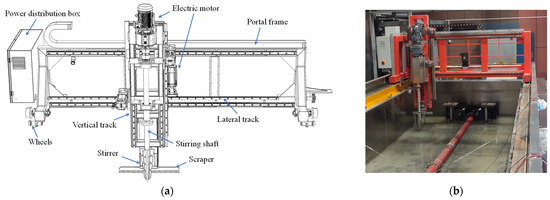The soil stirring system contains a portal frame, a power system, a changeable stirrer, and a scraper, as shown in Figure 14. The portal frame can travel along the track of the soil tank, whereas the vertical track can move horizontally along the lateral track that was fastened on the frame. Four electric motors were used in this system. The first one was to control the movement of the portal frame, the second one was fixed to the vertical track to drive its lateral movement, the third one was connected to the stirring shaft to control its vertical position, and the last one was installed on the top of the shaft to rotate the shaft and stirrer. The stirrer can be changed according to the property of the test soil. The scraper was adopted to guarantee the planeness of the clay, and its vertical position can also be adjusted to fit different targets of soil depth. The scraper is also detachable. Therefore, when the stirrer or the scraper was working, the other was removed to avoid interference.