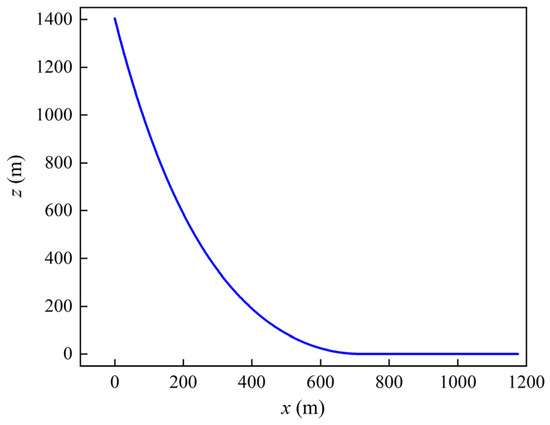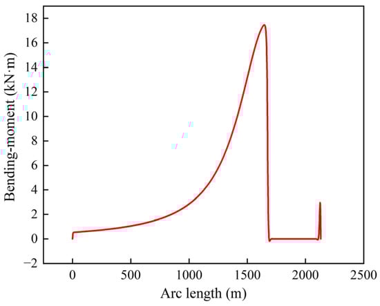 The prototype SCR used in this study has been put into production in the Lingshui project in China. The SCR is 2130 m long, with an outer diameter of 168 mm and a thickness of 18.3 mm. The seabed is clayey soil with an undrained shear strength of 4–8 kPa. Each end of the SCR was modeled as hinged in the numerical model. Detailed parameters used in the model are listed in Table 1. The static configuration of SCR was established under the submerged weight and soil resistance, as shown in Figure 15. The static in-plane bending moment was concentrated within the catenary part near the TDP as shown in Figure 16, with a maximum value of 17.47 kN·m. The distribution of seabed resistance and the developed seabed trench profile are shown in Figure 17. The resistance kept increasing within the trench mouth, and reached its peak value at the deepest point of the trench. Subsequently, the resistance decreased slightly along the trench tail and stabilized at the value that equaled the submerged self-weight of SCR.