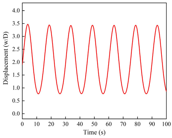 A reference point P at the arc length of 1660.0 m was taken as the truncated point in the model test. The vertical clearance between point P and the seabed was 0.3 m when the static configuration of SCR was established. After applying a harmonic heave motion with an amplitude of 1.0 m and a period of 15 s, the time history of the vertical displacement of point P was obtained, as shown in Figure 18. It proves that harmonic sine-wave motions are suitable to be applied to the truncated point of the model SCR. The relationship between the displacement ranges of the top end and point P is shown in Figure 19. When the heave motion reached an amplitude of 1.5 m, the moving range of point P was 0.72 m. Therefore, the applied displacement to the truncated point lay within the capability of the vertical hydraulic loading jack. Similarly, the horizontal moving range of point P was also less than the maximum displacement of the horizontal hydraulic loading jack.