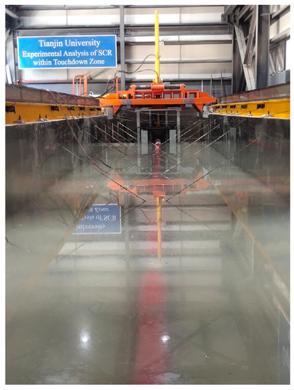 Although the full-scale model tests of SCR can provide convincible results [17], the cost of a single test is considerable, and the environmental loads cannot be controlled or recorded in detail. This hinders the comparison between the test and simulation results. By contrast, laboratory tests are reliable and cost-effective alternatives. The tests can be categorized into small-scale global tests, reduced-scale cut-off model tests, and centrifuge tests. For a small-scale global test, the whole SCR was modeled using a silicone tube, whereas the seabed was substituted by dry foam, wet foam, or glass [18]. Despite the global mechanical behavior of SCR being well represented, the interaction between riser and seabed clay or sand is oversimplified, and the stress variation within the TDZ cannot be obtained accurately.