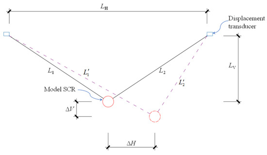 where and are the vertical and horizontal displacement components, respectively, and are the displaced distance between each transducer and the model SCR, is the horizontal distance between the transducers, and is the vertical clearance between the transducers and the middle of the section of model SCR at the beginning of the test, and can be calculated as , where is the initial distance between the transducer and the section of SCR. The same vertical elevations of the displacement transducers should be guaranteed when they were arranged. Since the model SCR was initially situated along the central line of the soil tank, the horizontal distances between the model SCR and each transducer in one group were the same.