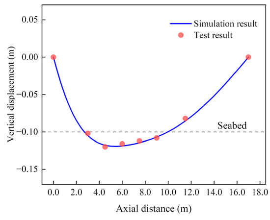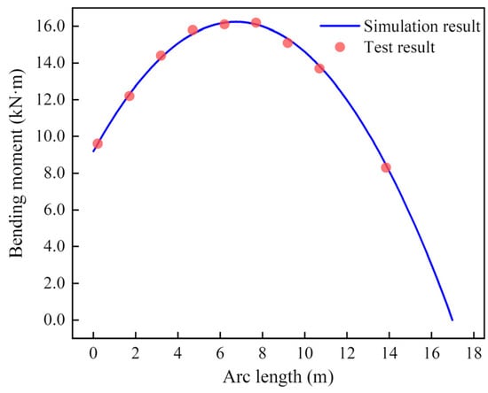 After the position of the loading point was situated 0.3 m above the elastic supporting end and the bending moment was applied, the model SCR developed its configuration, as shown in Figure 23. The angle of the riser at the tail end was nonzero, because the rigidity of this steel model SCR was larger than those of the PE and PVC pipes used in the literature. The simulated configuration of the model SCR using the VFIFE method was similar to the test result, proving the correctness of the model. The distribution of the bending moment is shown in Figure 24, and high similarities exhibit the accuracy of the strain data gathered by the strain gauges. The bending moment increased gradually from the loading end and reached its peak at 7.0 m. After reaching the maximum value, the bending moment decreased to zero when approaching the tail end.