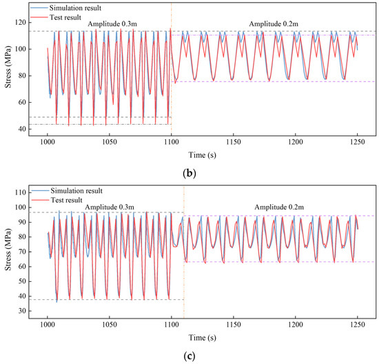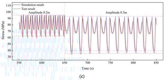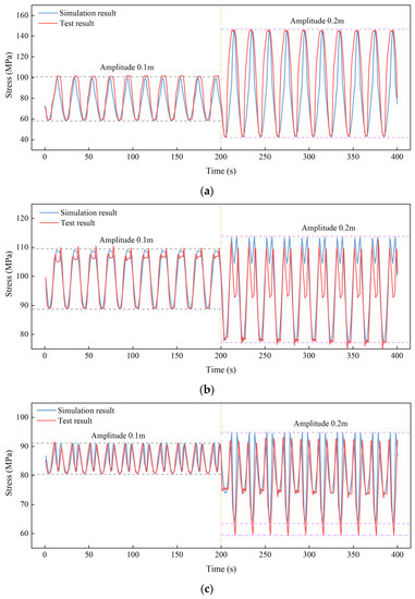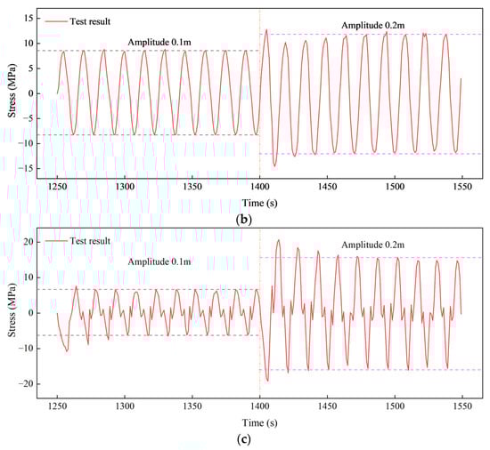 Time histories of the in-plane stress when the amplitude increased from 300 mm to 200 mm: (a) S2; (b) S5 and (c) S8.