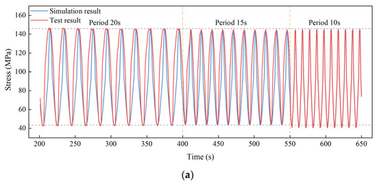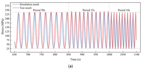 Three periods of 20 s, 15 s, and 10 s were chosen to study the influence of the loading frequency. The time history curves of stress at points S2, S5, and S8 under different loading periods are drawn in Figure 27 and Figure 28, when the loading amplitudes were 200 mm and 300 mm, respectively. Although different loading periods were selected, the maximum and minimum stresses did not exhibit significant differences, and the trends of stress variation within different loading cycles were similar. The maximum difference in the stress ranges under different loading frequencies was less than 5%. This is attributed to the fact that the total length of the truncated model SCR is less than the in situ one, and therefore, the dynamic effect is not significantly affected by the loading period. However, for the in situ SCR, a higher loading frequency will induce a severer stress variation and larger fatigue damage, since the dynamic effect is more significant.