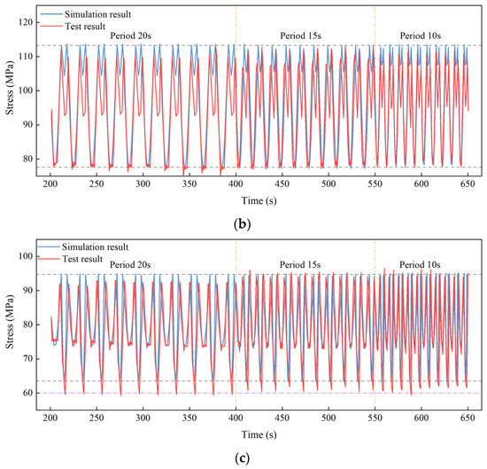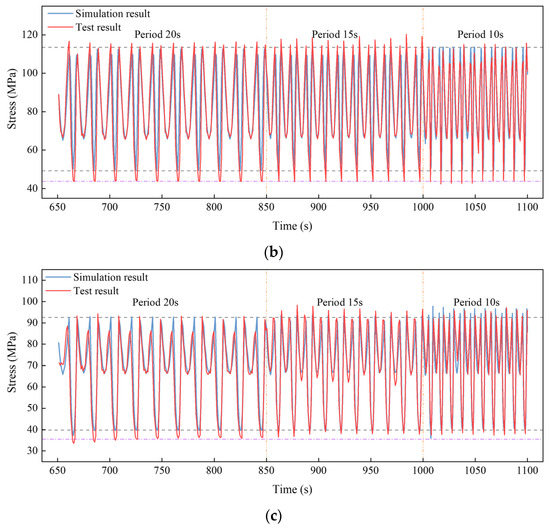 Time histories of the in-plane stress when the amplitude was 300 mm and the period decreased from 20 s to 10 s: (a) S2; (b) S5 and (c) S8.
