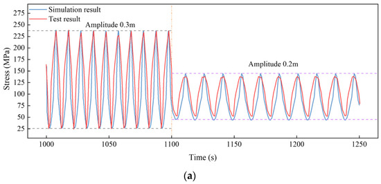 Regarding S5 and S8, the time history curves of in-plane stress were no longer sinusoids, as shown in Figure 25b,c. The stress decreased when the truncated point of the model SCR approached the upper end, and vice versa. The riser segment within the middle of the SCR began to penetrate the seabed when the riser was lowered. The stress value apparently decreased during the riser penetration, since the seabed resistance became larger than the submerged weight of the riser and decreased the bending moment at the middle of the SCR. The decrease in stress was more significant for S8 than for S5. Subsequently, the riser was uplifted, and the stress increased and reached the second peak value as the seabed resistance was released. This second peak value may have been larger than the first peak because the clay seabed could provide the suction force when the riser segment began to uplift. This phenomenon was captured by both of the experiment and numerical simulation. The minimum value of stress was reached when the riser was uplifted to the top position for S5, whereas the minimum stress of S8 occurred when the SCR was lowered and a larger seabed resistance was activated. Furthermore, the variation in the minimum stress was more noticeable than the variation in the maximum stress. The stress range increased by 139.9%, 74.0%, and 203.4% for S2, S5, and S8, respectively, when the displacement amplitude increased from 100 mm to 200 mm.